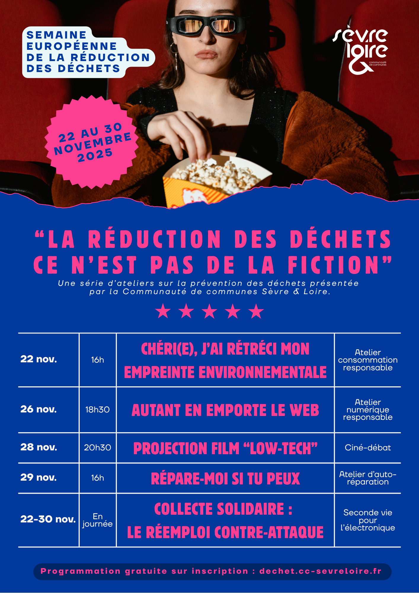 «La réduction des déchets ce n’est pas de la fiction». Du 22 au 30 novembre, préparez-vous à vivre un événement qui met l’action durable sous les projecteurs ! Le service Déchets de la Communauté de communes de Sèvre & Loire organise un programme riche en animations et en découvertes, dans le cadre de la Semaine Européenne de la Réduction des Déchets (SERD), coordonnée en France par l’ADEME, l’agence de la transition écologique.