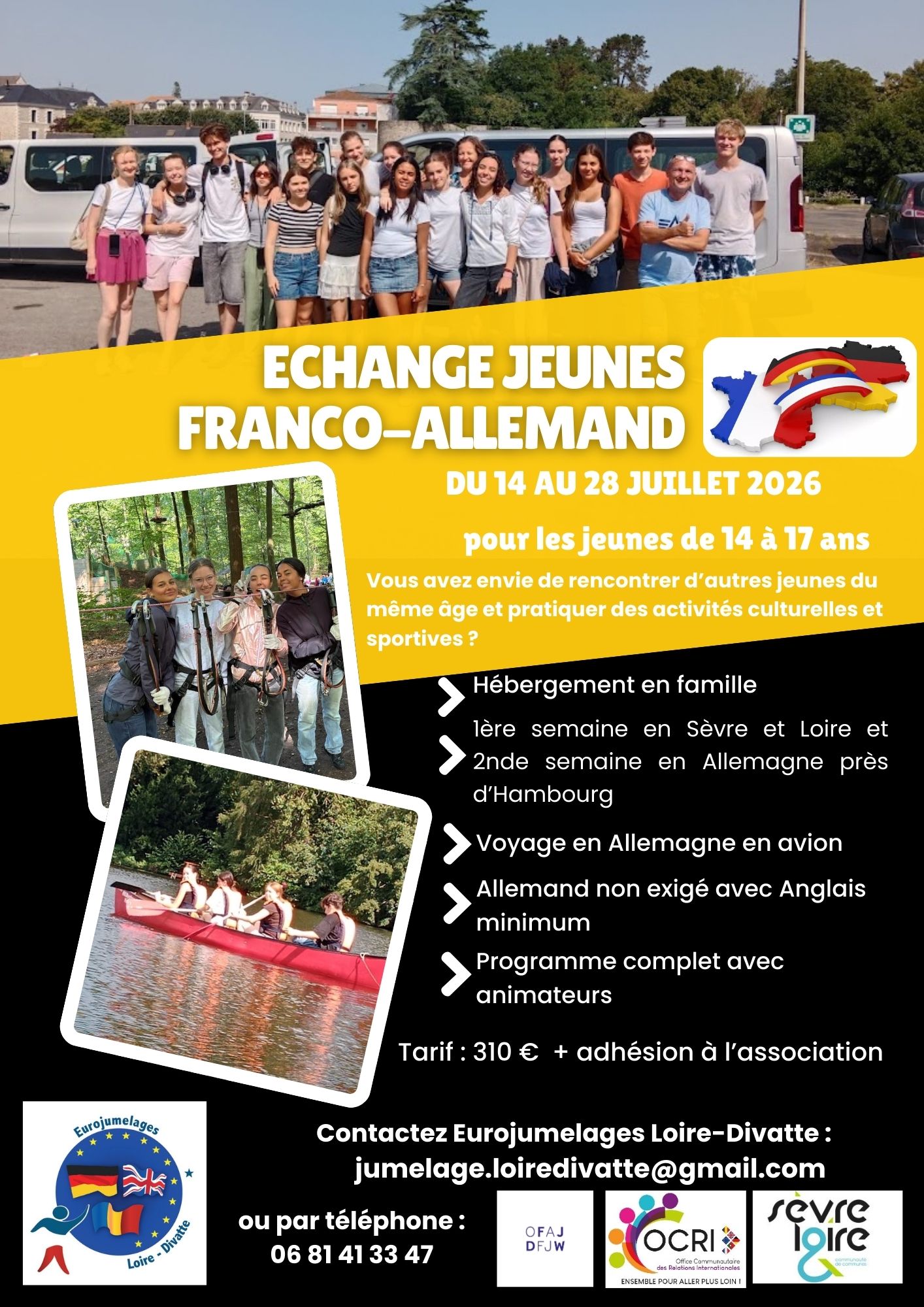 L'association Eurojumelages Loire-Divatte propose un échange franco-allemand pour des jeunes de 14 à 17 ans du14 au 28 juillet 2026 : première semaine sur les communes de Sèvre et Loire et seconde semaine à Trittau en Allemagne.